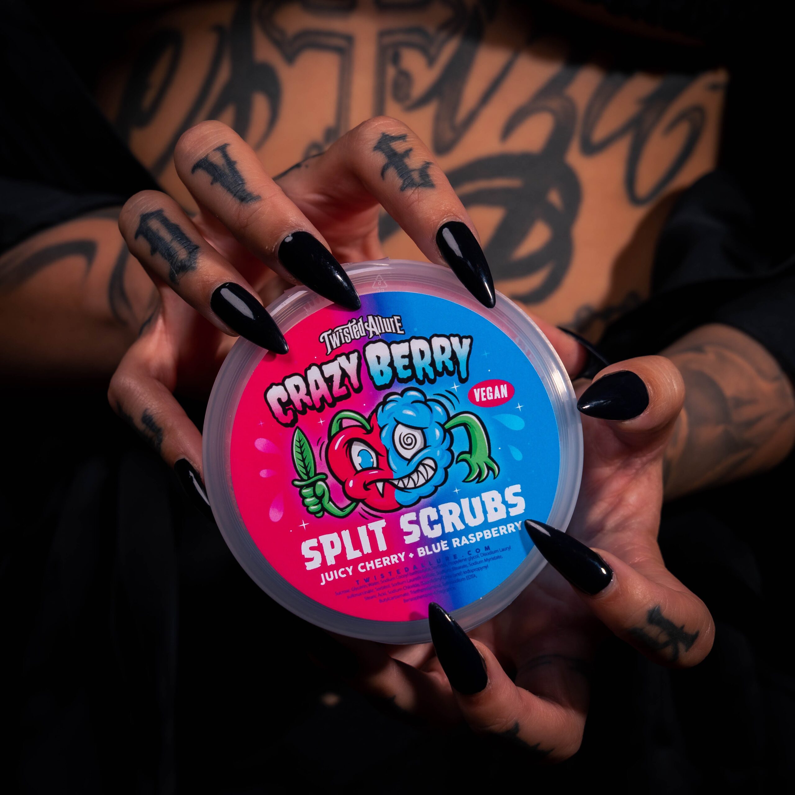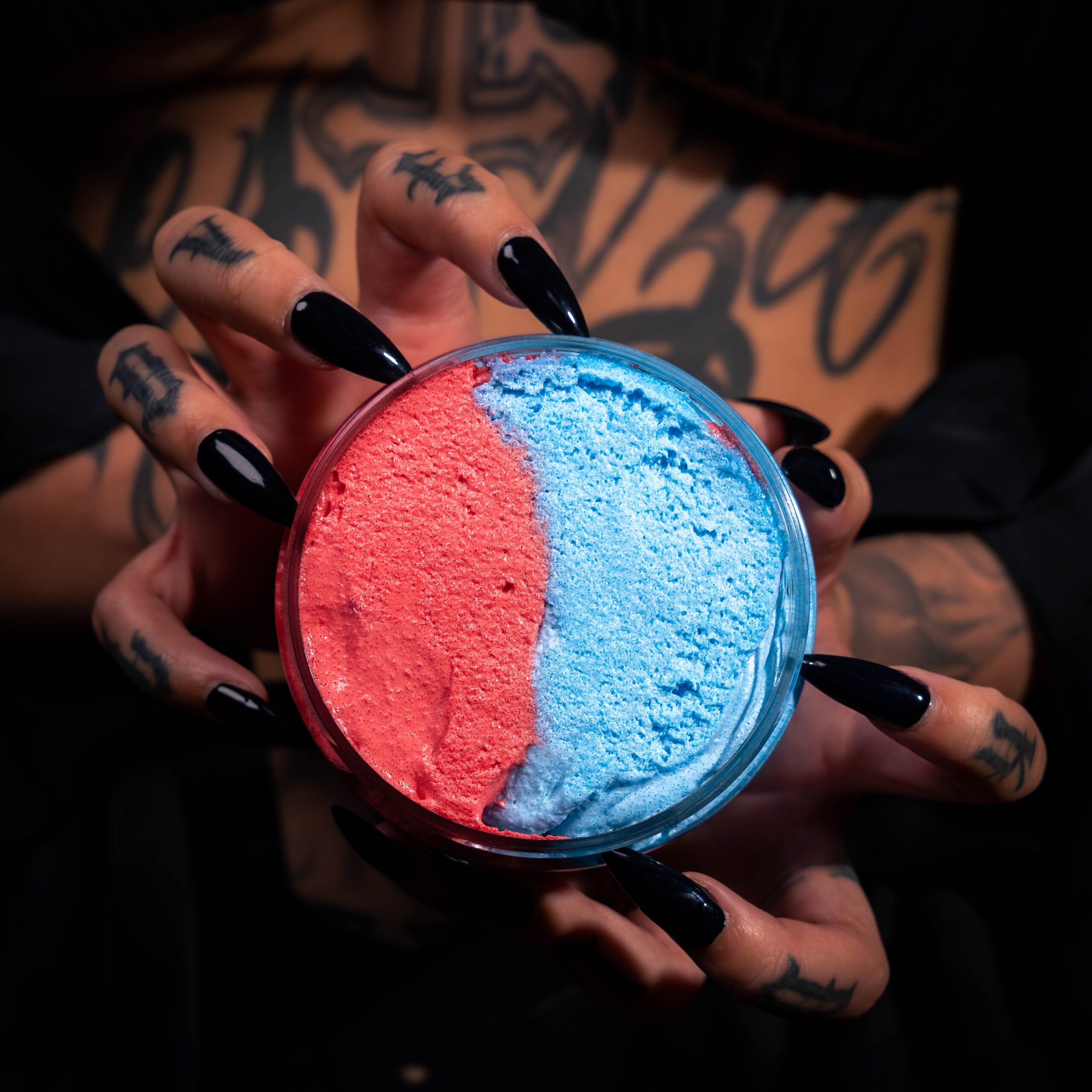 Half cherry. Half blue raspberry. All-out fruity chaos. This red and blue sugar scrub buffs you smooth while leaving you smelling like a berry-fueled meltdown.
